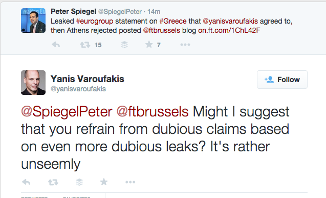 Ο κ. Βαρουφάκης, διαψεύδει μέσω twitter τον άθλιο επικεφαλή του γραφείου Βρυξελλών των Financial Times Πίτερ Σπίγκελ για το κοινό ανακοινωθέν καθώς και τα "παπαγαλάκια" των Ελληνικών μέσων μαζικής εξαπάτησης.